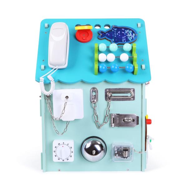Od zvonku až k telefonu! Tento domek přináší spoustu zábavy, díky které si vaše dítě může rozvíjet svou zručnost, zvědavost a zejména jemnou motoriku. Zámky, pásky a šňůrky dávají dítěti možnost procvičovat různé vázání, spojování, otáčení či otevírání a připravit se tak zábavným způsobem na každodenní úkony.