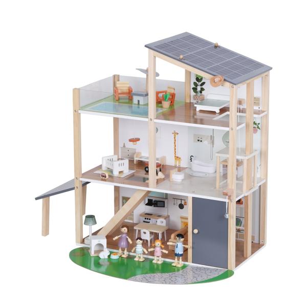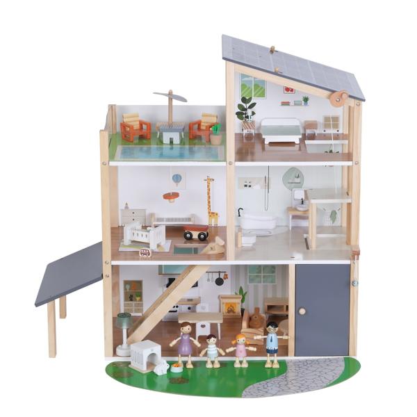 Vítejte v domečku, kde se bydlí jedna radost! Prostorný dřevěný domeček je plně vybaven nábytkem i doplňky. Najdete v něm prostornou kuchyni propojenou s útulným obývacím pokojem, stylovou koupelnu s vanou, dětský pokojíček, ložnici i luxusní střešní terasu pro chvíle pohody. A aby toho nebylo málo, nechybí ani výtah. Zatočte klíčkem a vyveďte rodinku až na druhé patro. Součástí sady je roztomilý domácí mazlíček králiček s vlastním domečkem a čtyřčlenná rodina připravená zabydlet se a začít psát svůj příběh.