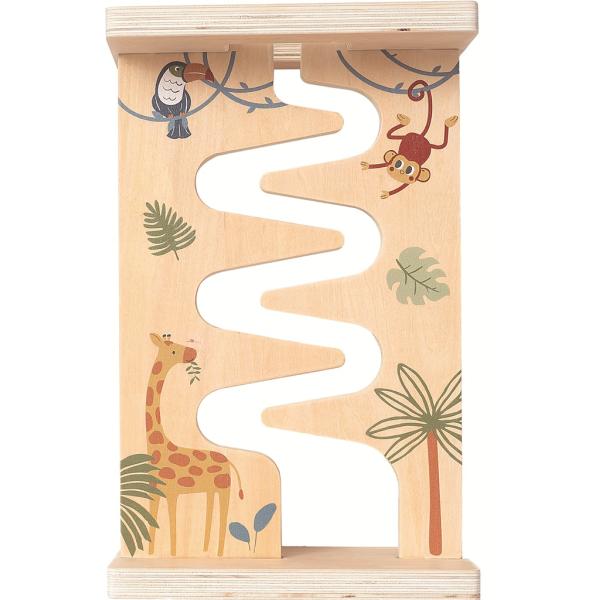 Zábavný dřevěný labyrint potěší každého malého objevitele. Stojánek ve barvě dřeva je ozdoben motivy veselých zvířátek a přírody a vyřezaná cestička slouží jako labyrint pro dřevěná kolečka s obrázky zvířátek. Malí šikuli vedou kolečko vyřezanou dráhou dolů a rozvíjejí tak zábavnou formou jemnou motoriku, koordinaci ruka-oko a logické myšlení.