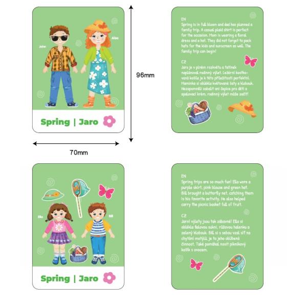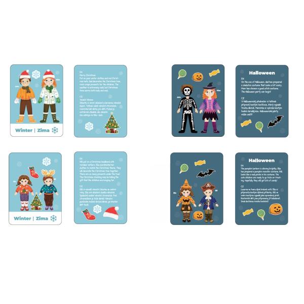 8 oboustranných kartiček s příběhy v slovenštině a angličtině (jaro, léto atd.)