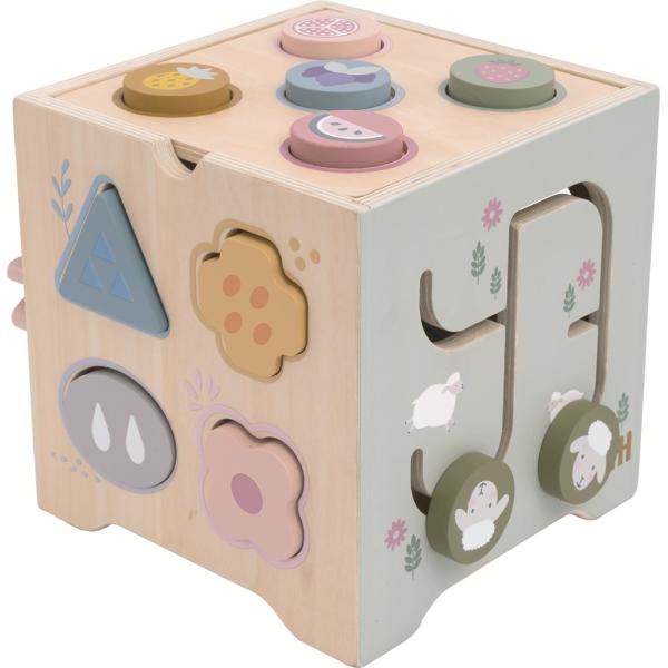 Objevujte svět a učte se zábavnou formou! Dřevěná motorická kostka s motivy farmy nabízí dětem pestrou škálu herních aktivit, které rozvíjejí jemnou motoriku, logické myšlení i koordinaci ruka-oko. Každá strana kostky přináší jinou zábavnou výzvu – od vkládání zvířátek, přes otáčení ozubenými kolečky, až po barevné vkládačky nebo jednoduché počítání. Hračka navíc obsahuje vyměnitelné víka s různými herními možnostmi. Děti mohou například přiřazovat obrázkové kolečka k správným předlohám a tím trénovat zrakové vnímání, třídění a soustředění. Neschází ani oblíbená zatloukací hra, při které je možné zatloukat dřevěné mrkvičky nebo kuličky. Během hry se děti učí rozpoznávat základní tvary, barvy i zvířátka. Všechny díly je možné uložit uvnitř kostky, takže po hraní zůstává všechno pohromadě a nic se neztratí. Díky jemným pastelovým barvám a roztomilým ilustracím zvířátek je hračka nejen atraktivní a zábavná, ale je i pěkným doplňkem dětského pokojíčku či herny. Hlavní vlastnosti: