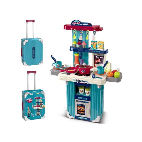 Krásná modrá kuchyňka v praktickém 2v1 provedení, kterou si děti mohou vzít kamkoliv! Po zavření se změní na moderní cestovní kufr s kolečky, po otevření se promění na plnohodnotnou kuchyni se všemi potřebnými doplňky na vaření, pečení a servírování. Ideální volba pro malé kuchaře a kuchařky.