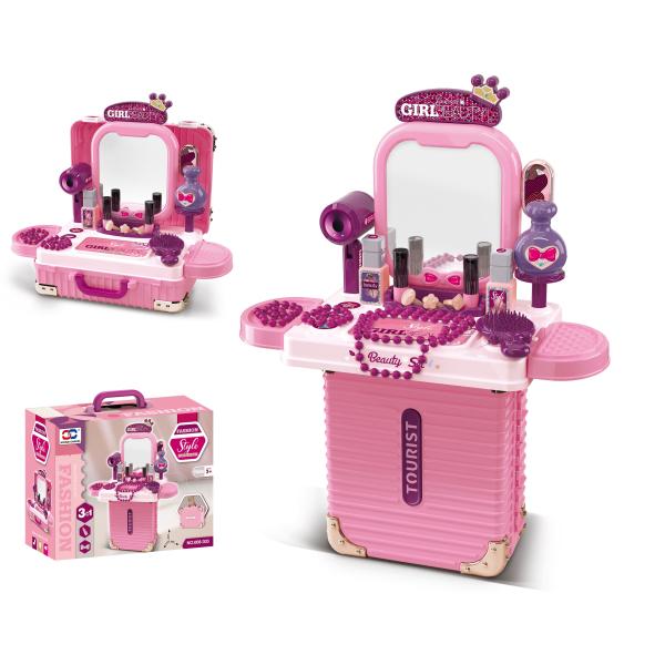 Tento nádherný 2v1 kosmetický set je splněným snem každé malé parádnice! V jedné chvíli je z něj kompaktní kufřík na kolečkách, který si děti snadno vezmou kamkoliv se sebou – a po rozložení se promění na plnohodnotný kosmetický stolek se zrcadlem a bohatým příslušenstvím. Ideální na kreativní hru, nápadité líčení i stylové proměny.