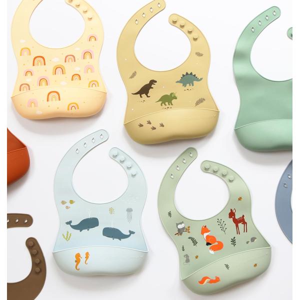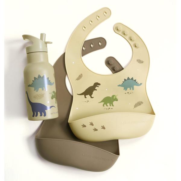 Sada dvou silikonových bryndáků, jeden s motivem dinosaurů a jeden v doplňkové jednobarevné verzi. Bryndáky jsou voděodolné, snadno se čistí a mají zachycovací přední kapsu. Bryndáky mají nastavitelnou velikost a lze je snadno srolovat a uložit. Silikonové bryndáky jsou navrženy tak, aby děti byly při jídle v pohodlí a čistotě.