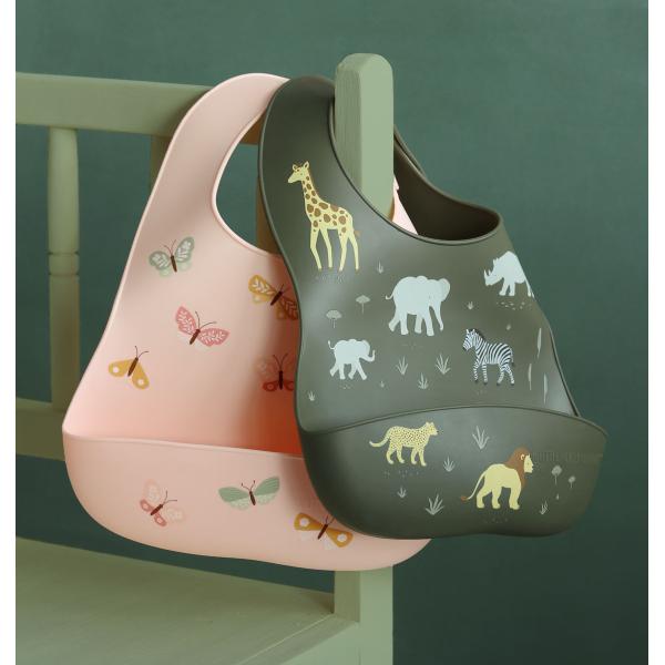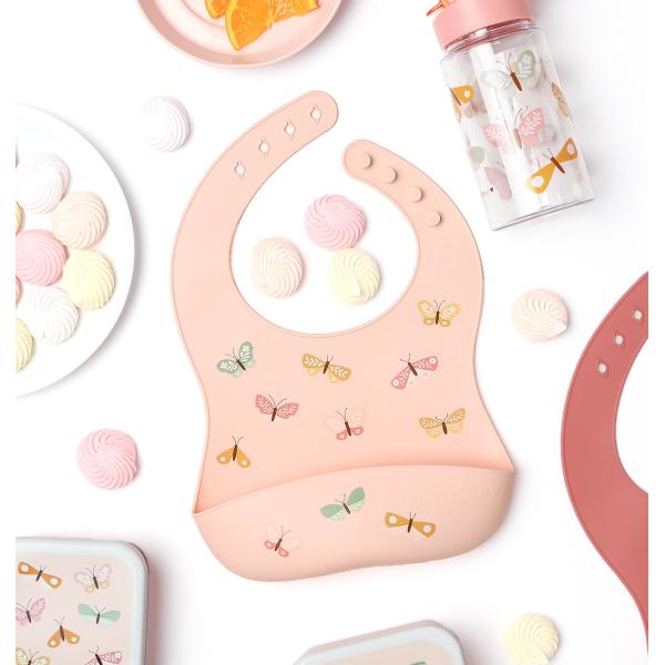 Sada dvou silikonových bryndáků, jeden s motivem motýlků a jeden v doplňkové jednobarevné verzi. Bryndáky jsou voděodolné, snadno se čistí a mají zachycovací přední kapsu. Bryndáky mají nastavitelné velikosti a lze je snadno srolovat a uložit. Silikonové bryndáky jsou navrženy tak, aby děti byly při jídle v pohodlí a čistotě.