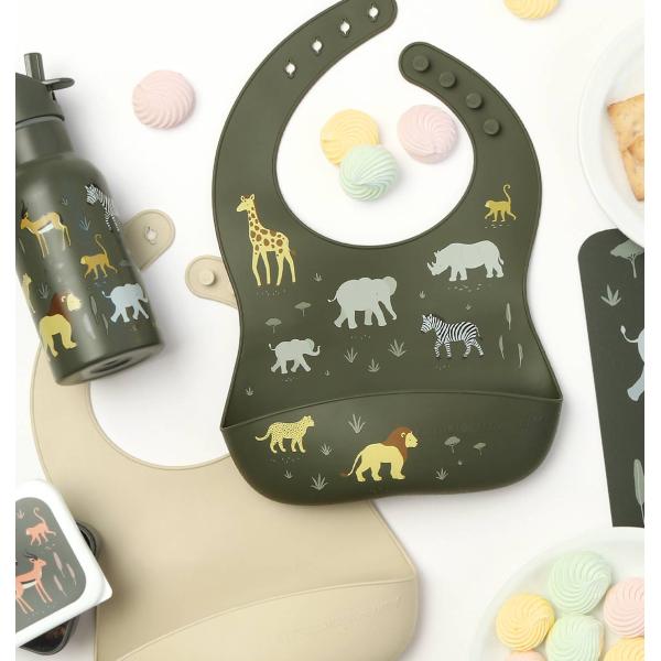 Sada dvou silikonových bryndáků, jeden s motivem zvířat z savany a jeden v doplňkové jednobarevné verzi. Bryndáky jsou voděodolné, snadno se čistí a mají zachycovací přední kapsu. Bryndáky mají nastavitelné velikosti a lze je snadno srolovat a uložit. Silikonové bryndáky jsou navrženy tak, aby děti byly při jídle v pohodlí a čistotě.