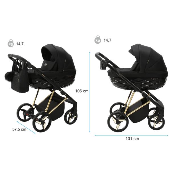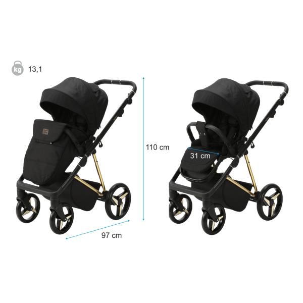 Technické specifikace:- rozměry ve složeném stavu: 101 x 57,5 x 110-119 cm (d x š x v)- rozměry složeného kočárku: 81 x 57,5 x 39 cm (D x Š x V)- hmotnost s hlubokou vaničkou: 14,7 kg- hmotnost se sportovním sedadlem: 13,1 kg- nosnost kočárku: 15 kg