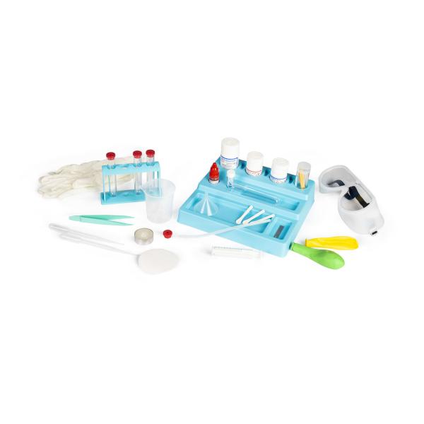Skvělý začátek pro každého začínajícího chemika! Prozkoumej úžasné kyseliny a zásady, báječné plyny, ohromující kovy a podivuhodnou vodu pomocí skutečných laboratorních technik. Věda je všude kolem nás, stačí se dotknout. Objev vztahy mezi molekulami a atomy. Co je směs a co roztok chemických látek? Naučíš se laboratorní postupy a zjistíš, jak spolu různé látky reagují. Vyrob si indikační roztok a otestuj kyselost a zásadu. A to vše s bezpečnými látkami. Sada Chemická laboratoř z edice Albi Science obsahuje více než 50 experimentů a plnobarevný manuál plný fascinujících faktů o neuvěřitelné chemii. Sada Chemická laboratoř obsahuje : hydrogenuhličitan sodný 50 g, kyselinu citrónovou 20 g, síran měďnatý 4 g, červené tekuté barvivo 5 ml, filtrační papír, balónky, trychtýř, bílou vlnu, 3 lžičky, lakmusové papírky, svíčku, injekční stříka 2 pipety, pinzetu, hadičku, kousek zinku, stojan na 4 zkumavky s víčky, odměrku, ochranné brýle a rukavice. Věk : 8+