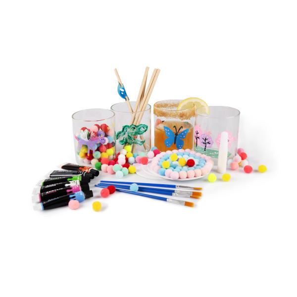 Sada obsahuje: 7 tub akrylových barev (po 12 ml), 4 štětce, 4 poháry odolné vůči vysokým teplotám, distanční pásku nalepenou na pohár – zajišťuje vzdálenost mezi místem kontaktu s rty a barvami, 8 bílých papírových brček, 1 sáček barevných pomponů, 4 kruhové kartonové šablony na podtácky, 1 lahvičku lepidla (6 ml), 4 šablony na malování pohárů, 4 šablony na podtácky, 8 vzorů na navlékání na brčko, návod.
