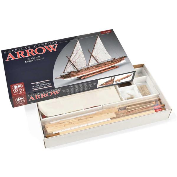 Charakteristika:Stavebnice statické makety historické lodi AMATI Arrow bitevní loď 1814 1:55 kit. Šlo o dělový plachetní člun. Set obsahuje všechny součásti potřebné ke stavbě tohoto výjimečného modelu. Dřevěné díly jsou řezány laserem.Obsaženy jsou rovněž plachty a vlajky. Set je doplněn mnoha detailními ilustracemi.
