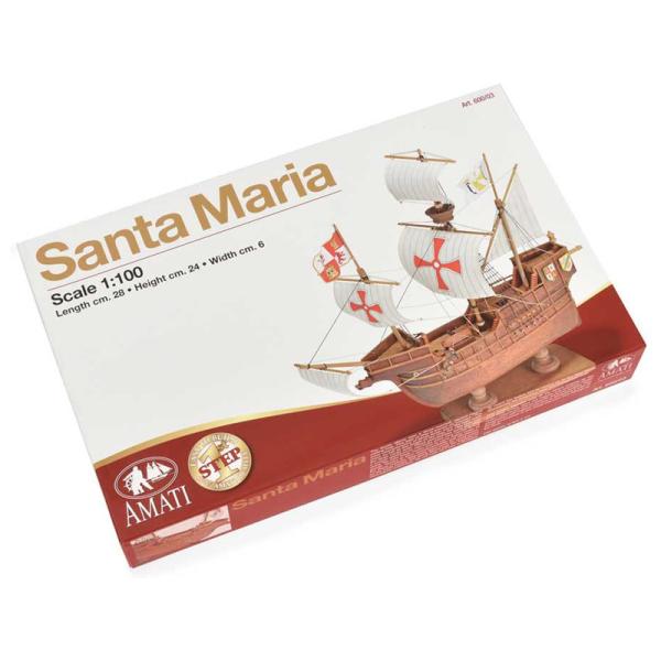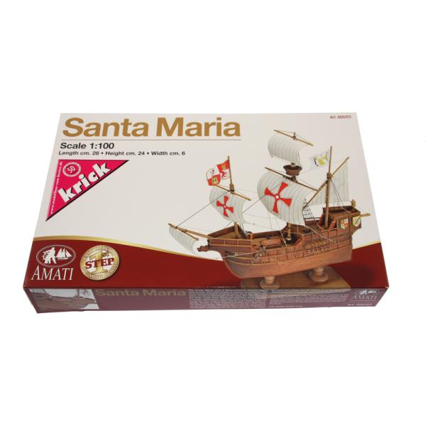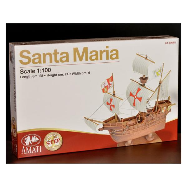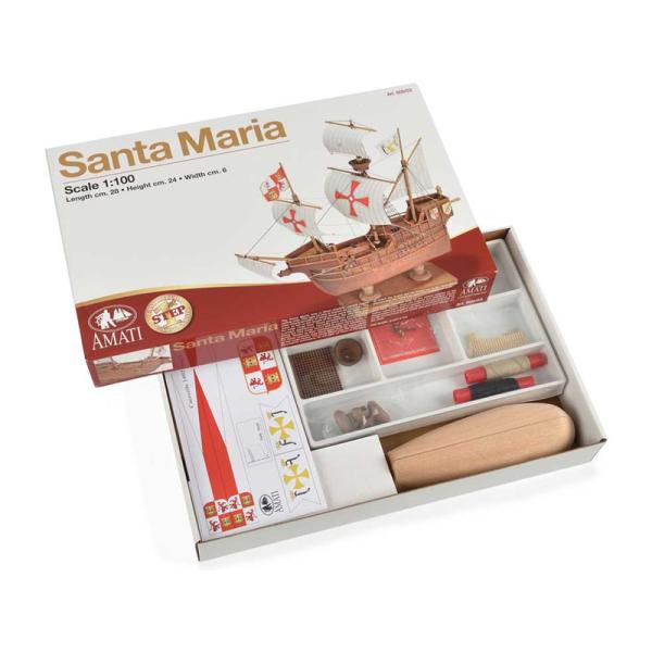 Charakteristika:Stavebnice statické makety historické lodi, AMATI Santa Maria 1:100 First step kit. Historické lodě jsou jedněmi z nejoblíbenějších lodních modelů, proto byla vytvořena série First step kit, která je určena pro začátečníky. V setu je hotový dřevěný trup lodi, kýl s výřezy a drobné příslušenství. Plachty nejsou v balení.