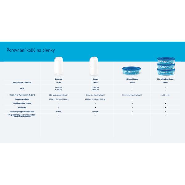 Kazeta obsahuje fólii – „nekonečný“ pytel – pro použité pleny. Kazeta Angelcare je pro všechny koše Angelcare, a všechny velikosti plen jednotná.