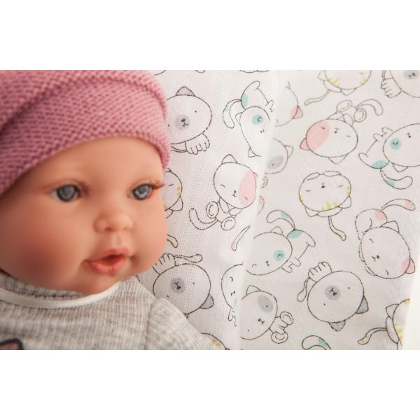 Zvuková, ručně vyrobená panenka s měkkým látkovým tělem, reagující na magnetický dudlík. Velikost 27 cm, Materiál: vinyl, organická bavlna. Součástí balení je 3 x knoflíková baterie LR44. Vyrobeno ve Španělsku – Onil. Doporučený věk od 3 let.