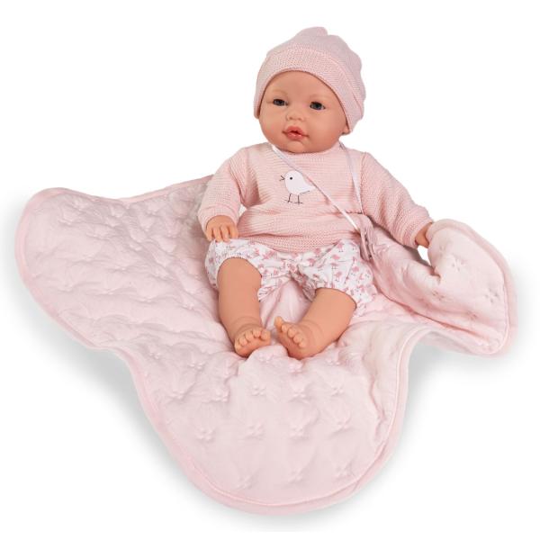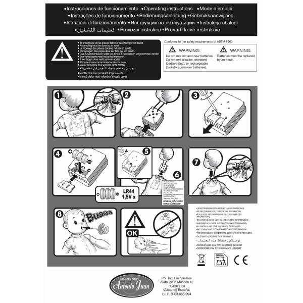 Mrkací a plačící, ručně vyrobená španělská panenka – miminko, reagující na magnetický dudlík. Po vytažení dudlíku z úst začne panenka říkat „mama“, „papa“ a vydávat reálný zvuk plačícího dítěte, který je možné utišit dudlíkem. Panenka má měkké látkové tělo, hlava a končetiny jsou vyrobeny z kvalitního měkčeného vinylu. Oblečení některých panenek bylo vyrobeno z organické bavlny, která zaručuje výrobu z ručně sbírané, ekologicky bez chemického ošetření pěstované bavlny. Firma Antonio Juan klade velký důraz na ekologii a proto jako první využívá v tomto odvětví zmíněnou bavlnu. Velikost 37 cm. Balené v dárkové krabici. Doporučený věk od 3 let. Součástí balení je 3 x knoflíková baterie LR44 s návodem na její výměnu. Baterie jsou spotřební zboží a proto jejich vybití není důvodem k reklamaci panenky.