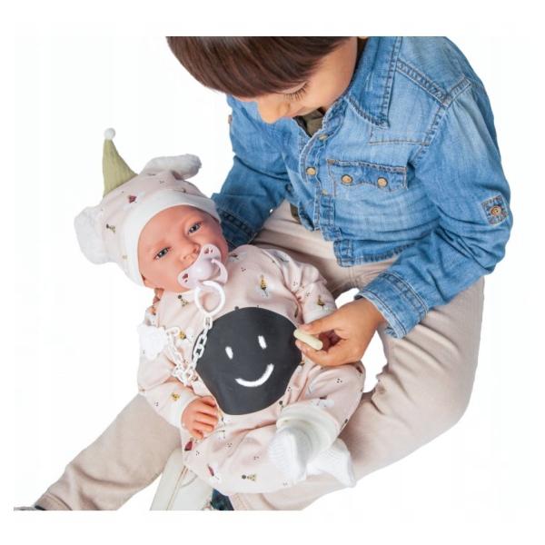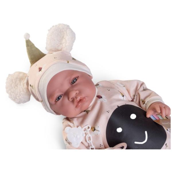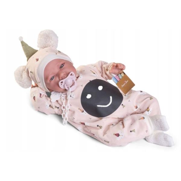 Ručně vyrobená realistická španělská panenka – miminko s realistickými prvky na obličeji a na končetinách. Ruce a nohy jsou k tělu přichyceny kloubem s možností polohování, což miminku umožňuje například i samostatné sezení bez opory. Panenka má měkké látkové tělo, hlava a končetiny jsou vyrobeny ze speciálního měkčeného vinylu, příjemného na dotek. Oblečení některých panenek bylo vyrobeno z organické bavlny, která zaručuje výrobu z ručně sbírané, ekologicky bez chemického ošetření pěstované bavlny. Firma Antonio Juan klade velký důraz na ekologii a proto jako první využívá v tomto odvětví zmiňovanou bavlnu. Velikost 42 cm . Baleno v dárkové krabici. Doporučený věk od 3 let.