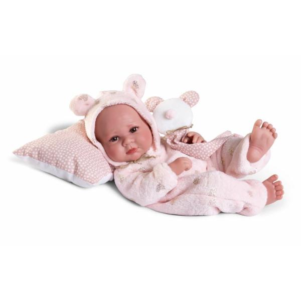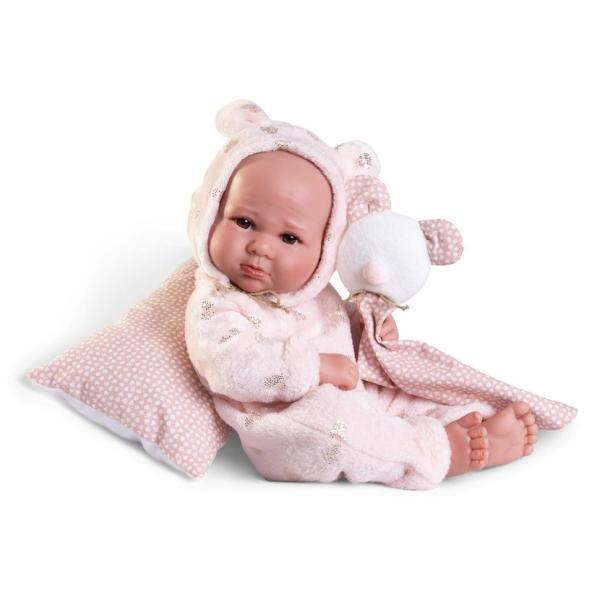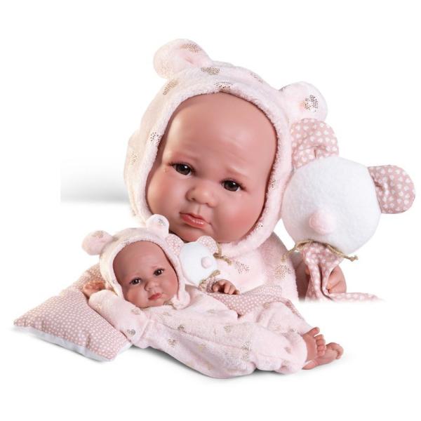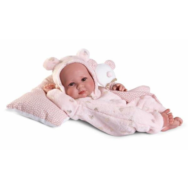 Ručně vyrobená realistická španělská panenka – miminko new born s celovinylovým tělem a realistickým vyobrazením různých miminkovských faldíků a detailů včetně pohlaví. Panenka je vyrobena ze speciálního měkčeného vinylu, velmi příjemného na dotek. Miminko se dá koupat, ale je třeba dát pozor, aby se nenamočily řasy. Odlepené řasy nejsou pak důvodem k reklamaci. Oblečení některých panenek bylo vyrobeno z organické bavlny, která zaručuje výrobu z ručně sbírané, ekologicky bez chemického ošetření pěstované bavlny. Firma Antonio Juan klade velký důraz na ekologii a proto jako první využívá v tomto odvětví zmiňovanou bavlnu. Velikost 42 cm . Baleno v dárkové krabici. Doporučený věk od 3 let .