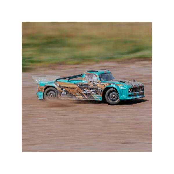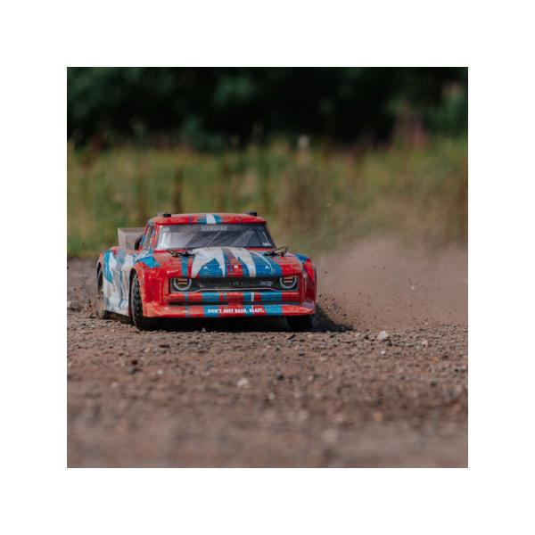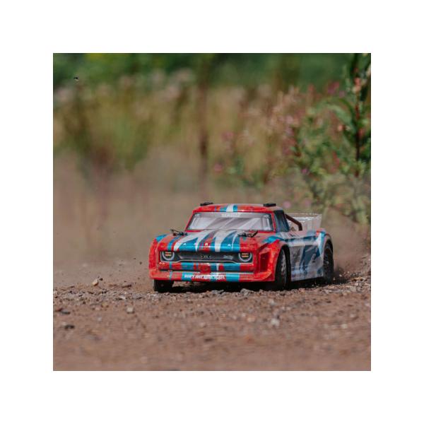 Podvozek doplňuje ohromující karoserie s potiskem v červené/modré nebo modrozelené/bronzové barvě. Střešní ližiny a ochranné oblouky chrání karoserii před poškozením. ARRMA® INFRACTION® 4X4 MEGA Street Bash Resto-Mod Truck je dodáván s 7-článkovou 8,4V NiMH baterií Dynamite® a síťovým nabíječem. Stačí přidat 4 baterie „AA“ do vysílače a můžete vyrazit!