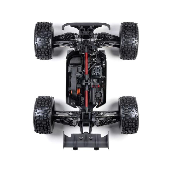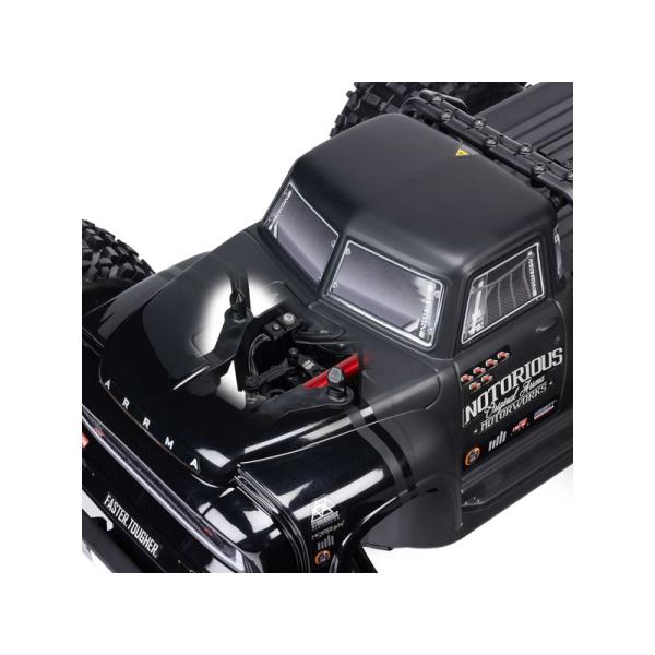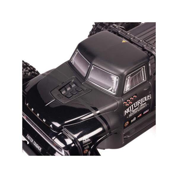Charakteristika:Nová verze V6 RC modelu auta Arrma Notorious 6S BLX v měřítku 1:8, která posouvá svou impozantní rychlost a sílu na další úroveň a přidává klíčová vylepšení pro odolnost. Díky tomu můžete provádět ještě lepší a odvážnější kaskadérské kousky, model je díky krátkému rozvoru pro to jako stvořený. Instalovány jsou vysoce pevnostní díly EXB (Extreme Bash), pro nespoutanou jízdu. Extra výkonný střídavý motor umožňuje rychlost model až 96 km/h. Nainstalována je kompletní elektronika s novým regulátorem Spektrum Firma V2, servo s kovovými převody a přijímač. Výborné jízdní vlastnosti na asfaltu i v terénu zaručuje nezávislé zavěšení a vyladěný náhon 4×4 s diferenciály. Karoserie, s retro vzhledem inspirovaným letadly z 2. světové války, je bezsponková pro rychlou a snadnou montáž a demontáž a pro čisté linie bez klipů.