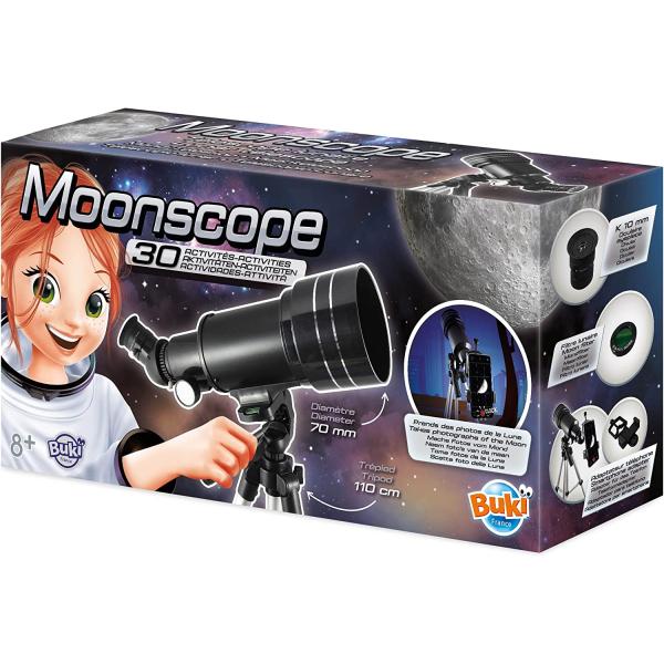 Teleskop speciálně vyvinutý pro děti na pozorování Měsíce Součástí sady je také 30 aktivit zaměřených na objevování Měsíce a jeho tajemství: fáze Měsíce, měsíční kalendář, interaktivní mapa Měsíce, krátery, moře na Měsíci, zatmění Slunce, odvrácená…