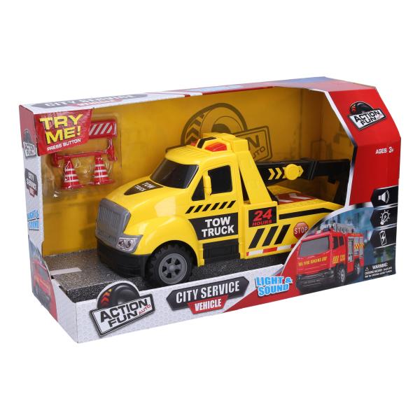 Auto odtahovka na setrvačník. Velikost 32 cm. Světelné a zvukové efekty, aktivace tlačítkem na střeše. Pohon na setrvačník. Pohyblivé rameno s hákem.
