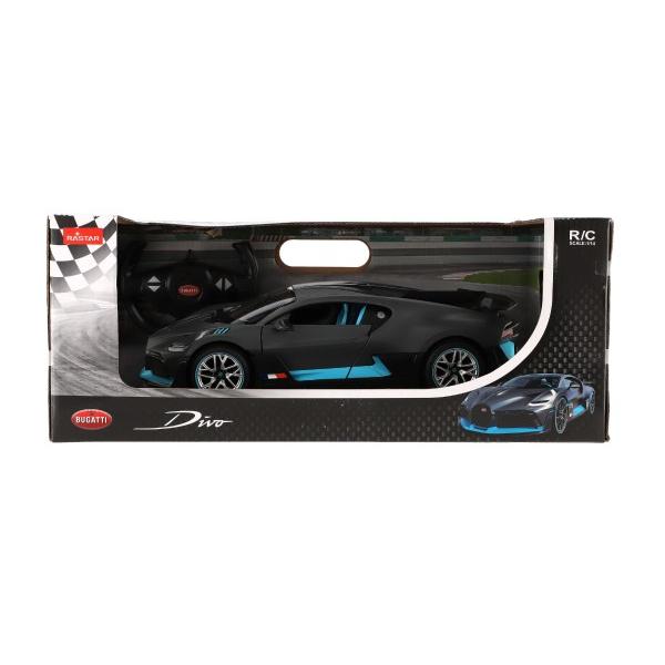 Krásný RC model auta Buggatti Divo v šedé barvě s modrými prvky. Jedná se o propracovaný model s plastovými doplňky, vůz má otevírací dveře. Auto je na dálkové ovládání ve tvaru sportovního volantu a dokáže se pohybovat do čtyř směrů – dopředu, dozadu, doprava a doleva. Frekvence je 2,4GHz. Měřítko je 1:14. Do auta patří 5x baterie AA, do ovladače 2x baterie AA, které nejsou součástí balení. Provozní doba: 30 minut Vzdálenost dálkového ovládání: 20 metrů Velikost auta je 32 cm. Rozměr balení: 43 x 18 x 25 cm Vhodné pro děti od 6 let.