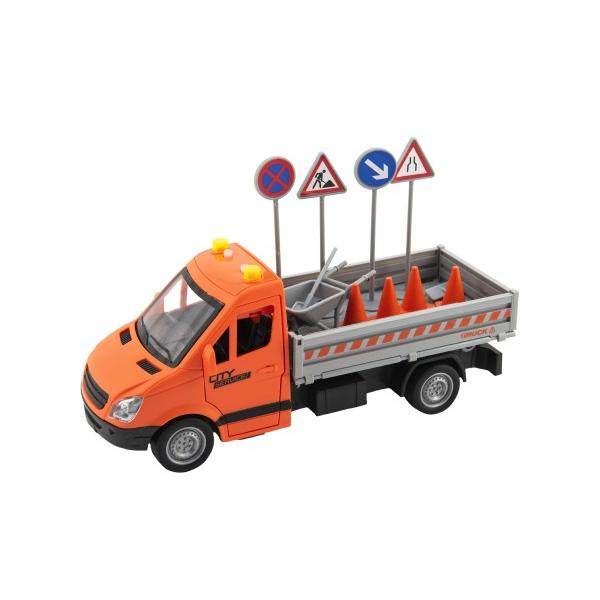 Silniční auto plné dopravních značek a pomůcek potřebných pro práci každého silničáře. Údržba silnic, chodníků a parků je důležitá v každé obci a městě. Auto je v měřítku 1:16, je na setrvačník, se světlem a…