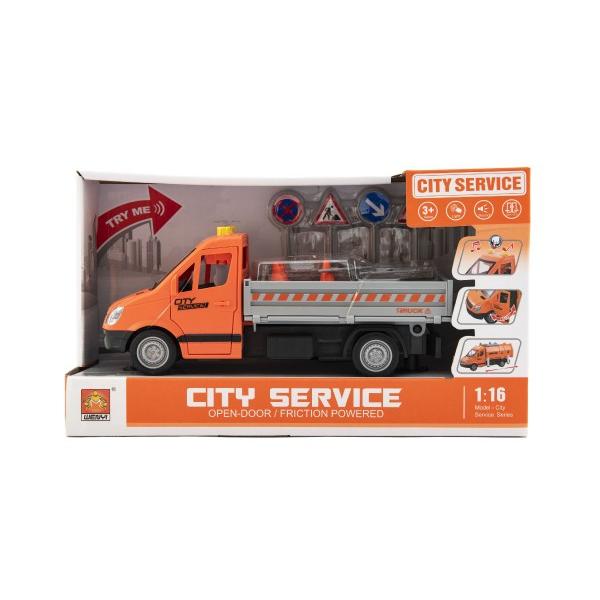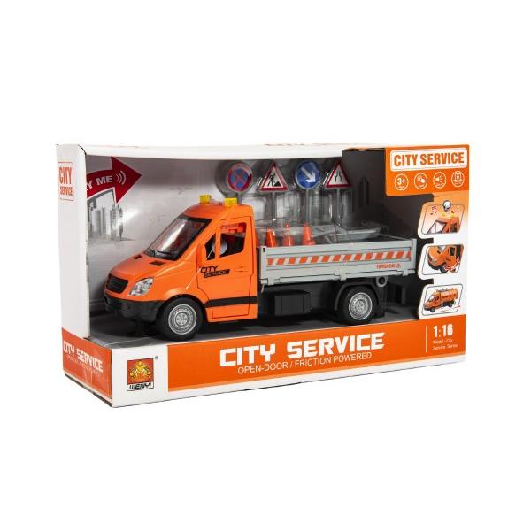 Silniční auto plné dopravních značek a pomůcek potřebných pro práci každého silničáře. Údržba silnic, chodníků a parků je důležitá v každé obci a městě. Auto je v měřítku 1:16, je na setrvačník, se světlem a se zvukem. Baterie 3x AG13 jsou součástí balení. Rozměry balení 32 x 19 x 12 cm. Vhodné pro děti od 3 let.
