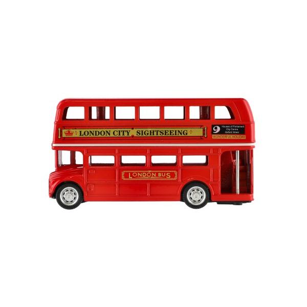 Zpětně natahovací červený autobus ‚Londýn‘ pro děti od 3 let. Klasický městský vůz s uzavřenou střechou a dvěma patry.