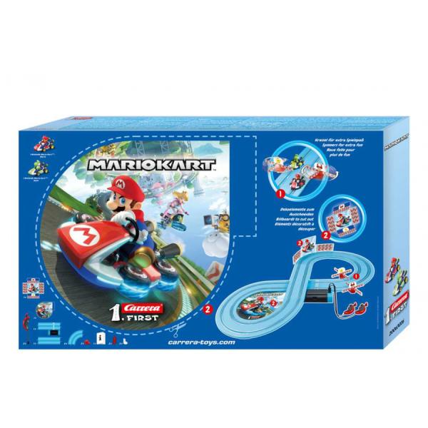 Autodráha Carrera FIRST dlouhá 2,4m s auty s postavami Mario a Yoshi od Nintenda, pro děti od 3 let, na baterie, obsahuje rovinky, zatáčky, točící vrtule, ovladače a dekorace s tématikou Mario Kart od Nintenda. Délka tratě : 2,4m Rozměry po sestavení : 93 x 45cm Obsah balení : 1x auto Mario Kart – Mario 1x auto Mario Kart – Yoshi rovinky zatáčky 2x vrtule pro větší zábavu při procházení 1x napájecí díl 2x ovladač rychlosti Podpěry, mantinely, návod Neobsahuje baterie (4x C) FIRST – první autodráha pro děti od 3 let ? měřítko dráhy 1:50 ? měřítko aut 1:50 ? analogový autodráhový systém ? autodráha na baterie (4x baterie C) ? doba jízda až 6 hodin ? všechna auta mají kontaktní kartáčky pro lepší přilnavost k dráze ? všechna auta mají magnet ? díky systému svorek se dráha snadno sestavuje i rozebírá ? přesné a stabilní provedení drah, včetně výškově stavitelných podpěr ? detailní, tamponová potištěné vozy ? originální licence Disney-Pixar Cars, Tlapková patrola, Mickey Mouse, Nintendo ? velmi kvalitní zpracování ? sety obsahují napájecí díl, 2x ovladač rychlosti, 2x auto, mantinely, spojky dráhy, český návod ? vhodné pro děti od 3 let CARRERA znamená ve španělštině závod a jedno Vám můžeme zaručit. Jakmile rozbalíte krabici s logem Carrera, rozproudí se Vaše závodní krev na nejvyšší otáčky a je jedno na jakém okruhu as jakým autem budete zrovna závodit. Tento pocit zažívají tisíce fanoušků už od roku 1963, kdy značka Carrera spatřila svou první závodní dráhu. Během následujících více než čtyřiceti let se Carrera probojovala až na úplnou špičku v oblasti autodráh, aut a jejich příslušenství. Dnes nabízí produkty nejvyšší kvality, které jsou určeny nejen dětem, ale i dospělým, pro které se staly autodráhy hobby na celý život.