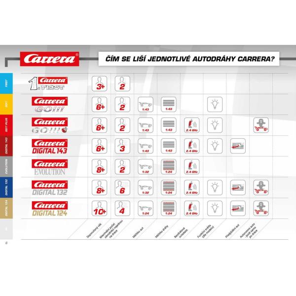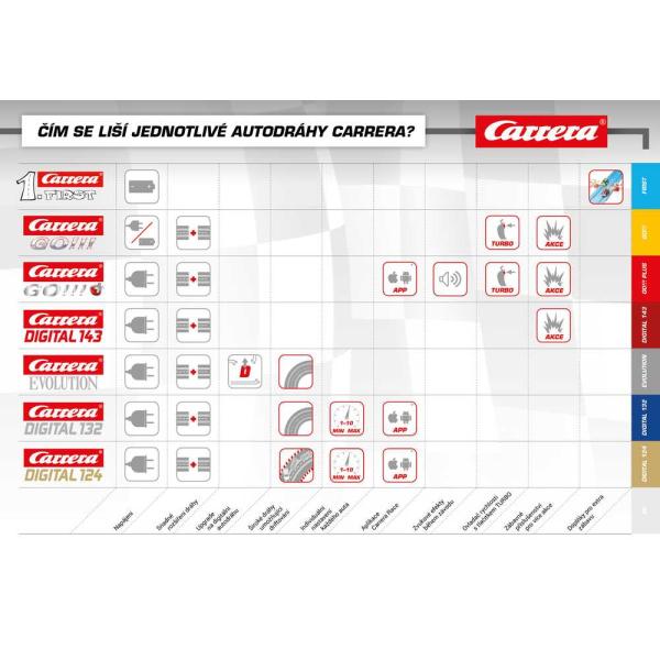 CARRERA znamená ve španělštině závod a jedno Vám můžeme zaručit. Jakmile rozbalíte krabici s logem Carrera, rozproudí se Vaše závodní krev na nejvyšší otáčky. Tento pocit zažívají tisíce fanoušků už od roku 1963. Carrera se za více než čtyřicet let probojovala na úplnou špičku v oblasti autodráh, aut a příslušenství. Dnes nabízí produkty nejvyšší kvality, určené nejen dětem, ale i dospělým, pro které se autodráhy staly celoživotním koníčkem.