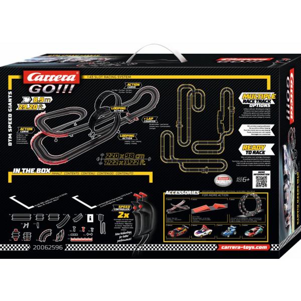 Autodráha Carrera GO!!! – délka 8,9 m s auty GT3 Audi R8 LMS a Lamborghini Huracán obsahuje looping, klopenou zatáčku, kolmou stěnu, rovinky, zatáčky, díl s počítadlem okruhů a další díly. Sestavte si různé varianty tratí podle vlastní fantazie. Nejdelší set GO!!!