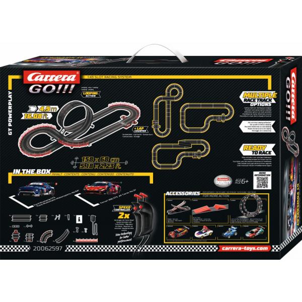 Autodráha Carrera GO!!! dlouhá 4,9 m s auty GT3 Ford Mustang a Ferrari 296, obsahuje přemostění, looping, rovinky, zatáčky, díl s počítadlem kol a další části. Můžete si postavit další různé tratě podle své fantazie.
