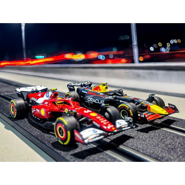 Autodráha Carrera GO!!! dlouhá 4,3 m s auty F1 Ferrari a Red Bull, obsahuje přemosťění, rovinky, zatáčky, díl s počítadlem kol a další části. Můžete si postavit další různé tratě podle své fantazie.