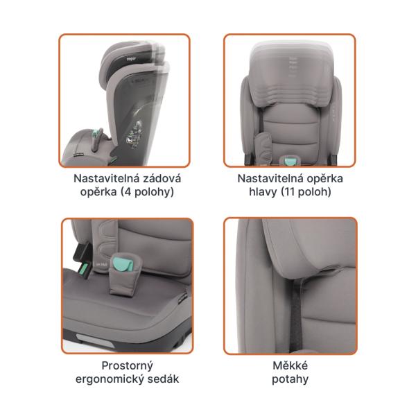 Bezpečně a pohodlně na cestáchProstorná autosedačka s měkkými potahy a možností naklonění do 4 ergonomických poloh zajistí pohodlnou cestu i při delší jízdě a během spánku. Polohování se dá jednoduše nastavit pojistkou v přední části autosedačky. Opěrka hlavy nabízí až 10 poloh nastavení, díky tomu autosedačka roste s dítětem.