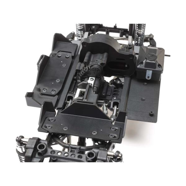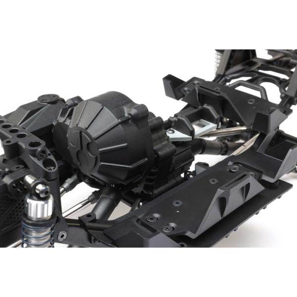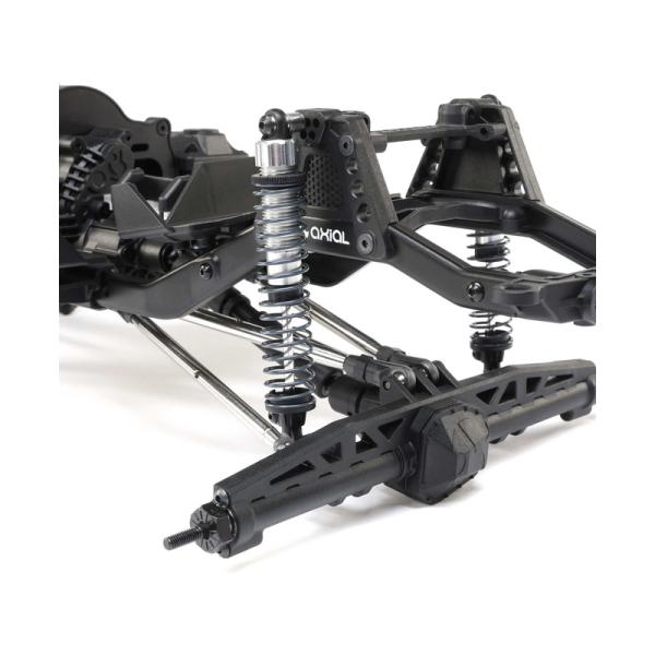 Zavěšení obsahuje 6 mm táhla z nerezové oceli a celokovové kulové čepy pro odolnost v terénu. Nastavitelné tlumiče plněné olejem mají hliníková těla se závitem a maticí pro snadné nastavení předpětí pružin.