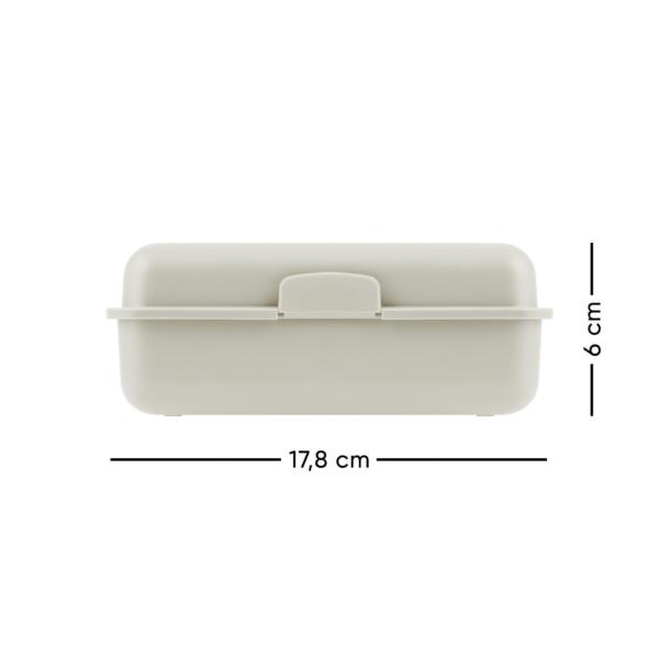 Plastový box na svačinu s uzavíráním na jednu zámek, obsahuje dělící přepážku. Rozměry: 17,8 x 12,2 x 6 cm.