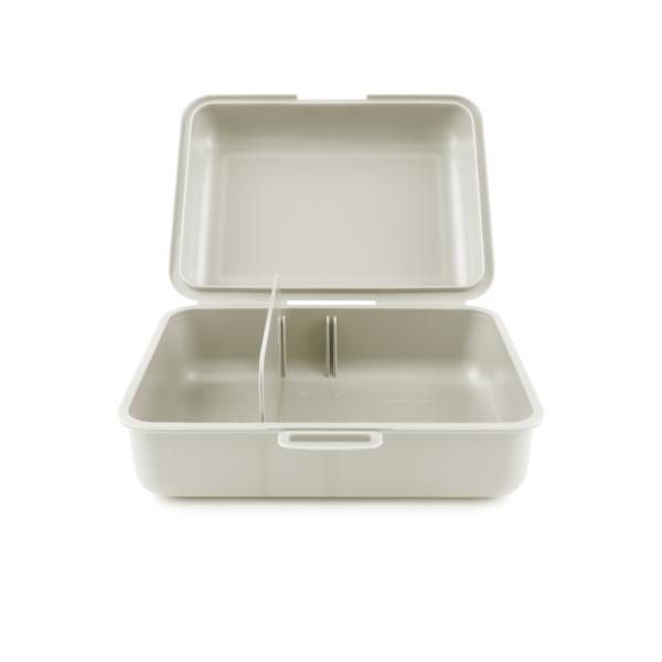 Plastový box na svačinu s uzavíráním na jednu zámek, obsahuje dělící přepážku.