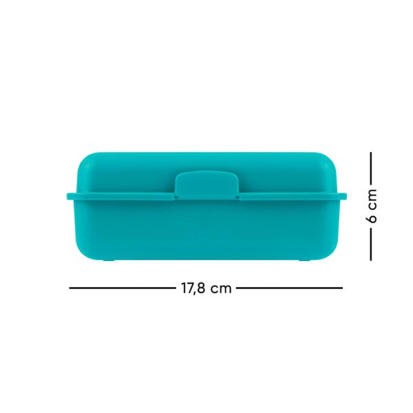 Plastový box na svačinu s uzavíráním na jednu zámek, obsahuje dělící přepážku. Rozměry: 17,8 x 12,2 x 6 cm.