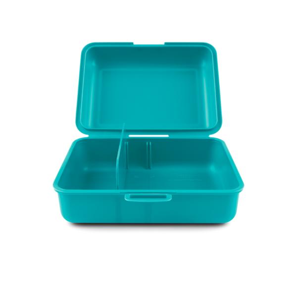 Plastový box na svačinu s uzavíráním na jednu zámek, obsahuje dělící přepážku.
