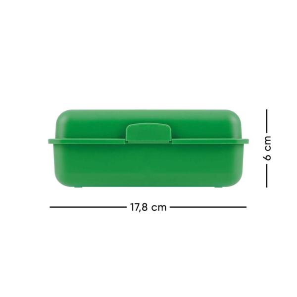 Plastový box na svačinu s uzavíráním na jednu zámek, obsahuje dělící přepážku. Rozměry: 17,8 x 12,2 x 6 cm.