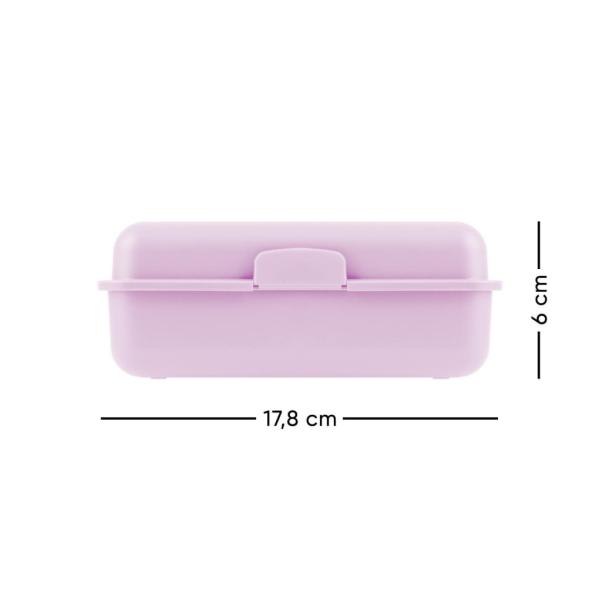 Plastový box na svačinu s uzavíráním na jednu zámek, obsahuje dělící přepážku. Rozměry: 17,8 x 12,2 x 6 cm.