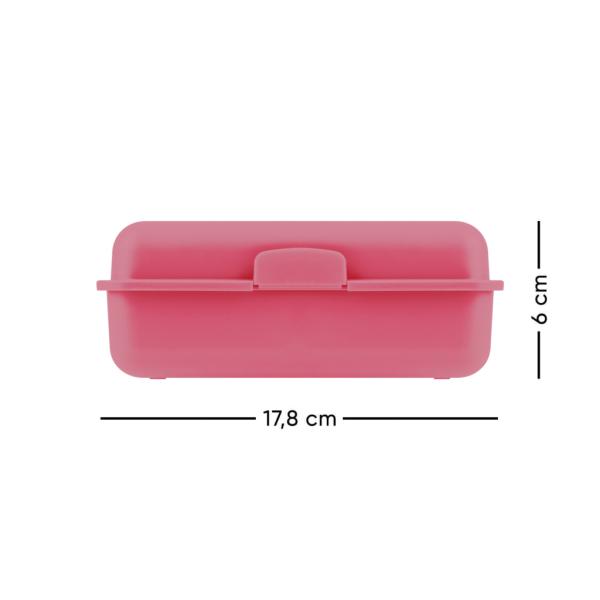 Plastový box na svačinu s uzavíráním na jednu zámek, obsahuje dělící přepážku. Rozměry: 17,8 x 12,2 x 6 cm.