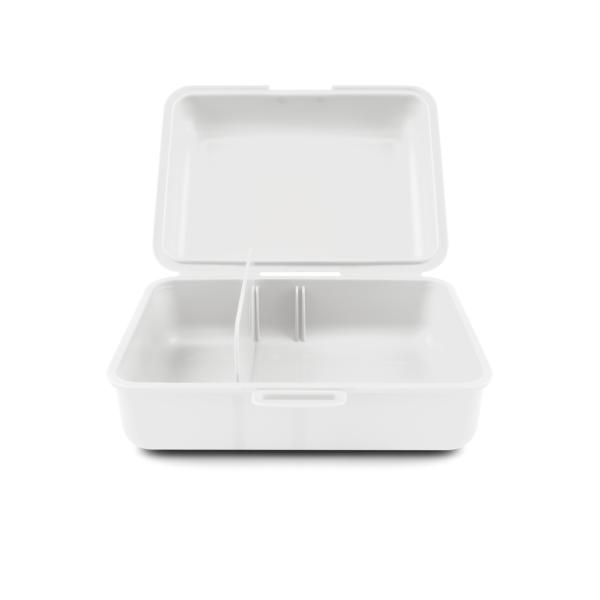 Plastový box na svačinu s uzavíráním na jednu zámek, obsahuje dělící přepážku.