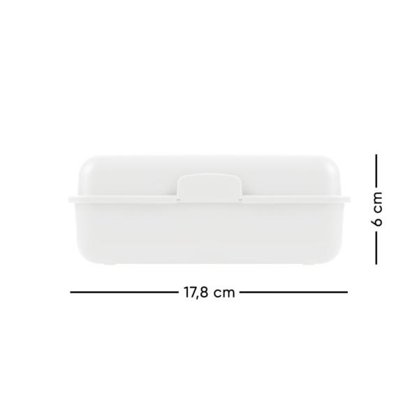 Plastový box na svačinu s uzavíráním na jednu zámek, obsahuje dělící přepážku. Rozměry: 17,8 x 12,2 x 6 cm.