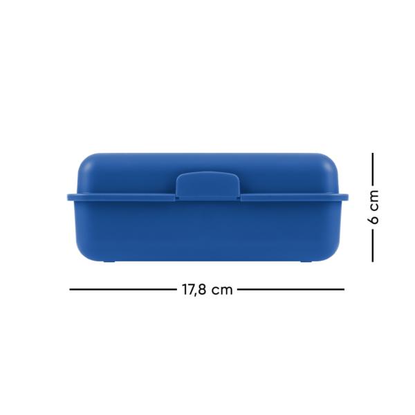 Plastový box na svačinu s uzavíráním na jednu zámek, obsahuje dělící přepážku. Rozměry: 17,8 x 12,2 x 6 cm.