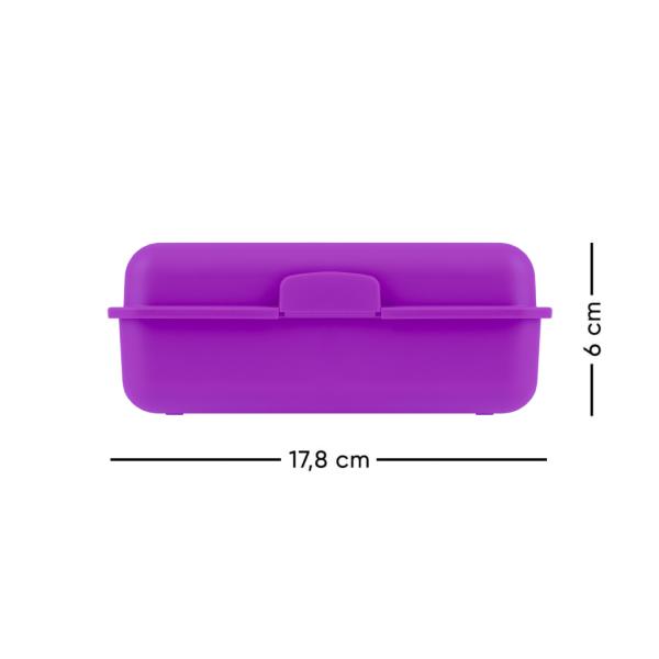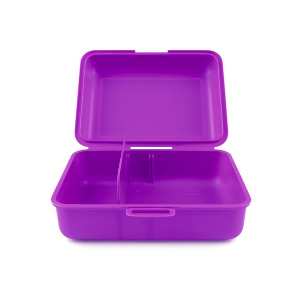Plastová krabička na svačinu s uzavíráním na jeden zámek obsahuje dělicí přepážku.