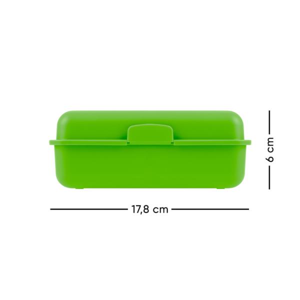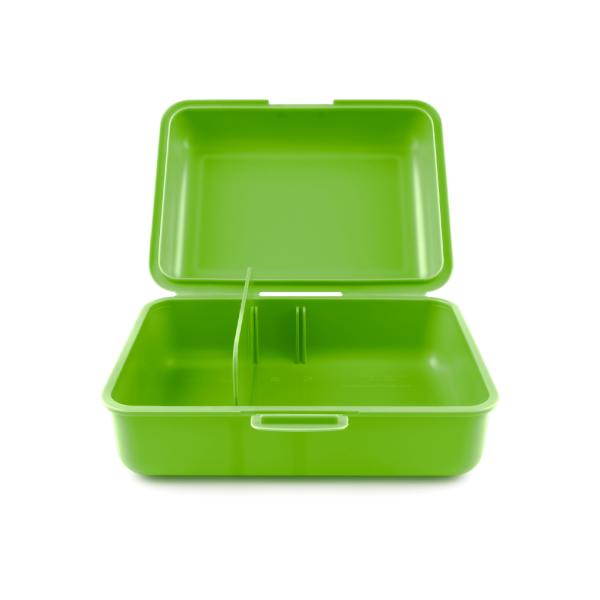 Plastová krabička na svačinu s uzavíráním na jeden zámek obsahuje dělicí přepážku.