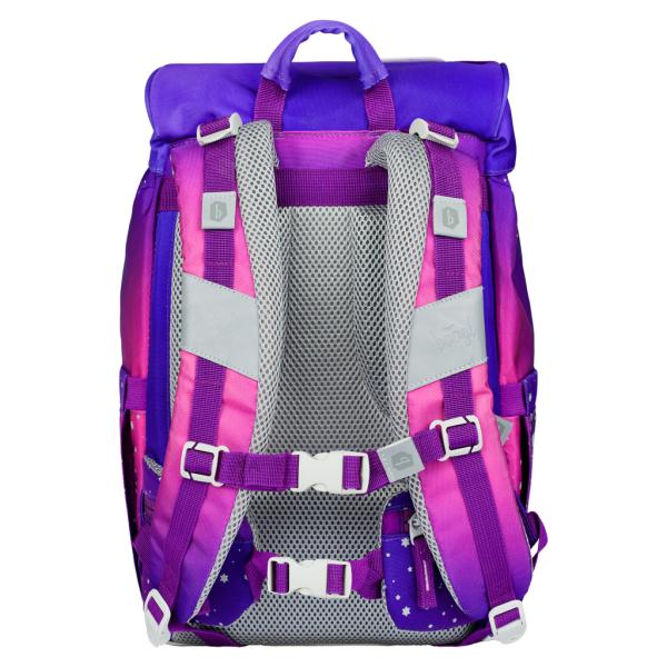 • Jednokomorové vnitřní uspořádání s kapsou a gumičkou na uchycení školních desek na straně zad slouží k jednoduché organizaci všech školních pomůcek.