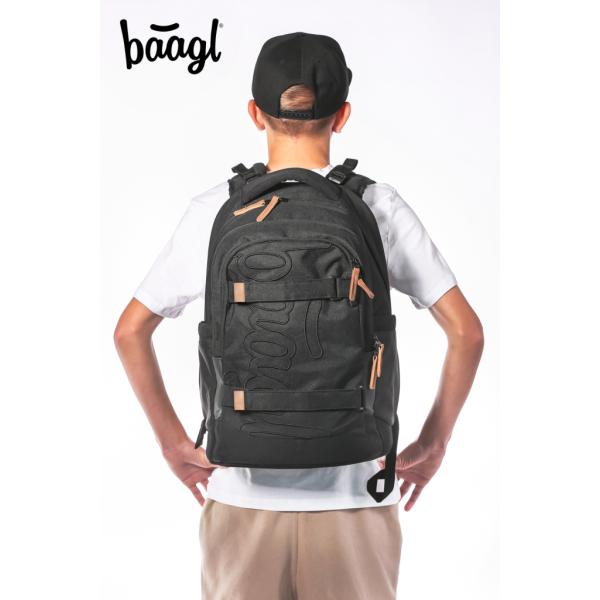ŠKOLNÍ BATOH SKATE MAX DARKNESS • Lehký batoh váží jen 1150 g a je vybaven posuvným zádovým systémem, který umožňuje nastavení až čtyř různých velikostí. • Kompaktní batoh Skate Max je ideální pro žáky a studenty od 155 do 185 cm, což odpovídá přibližně 3. ročníku základní školy a vyšším. • Batoh z recyklovaného, voděodolného materiálu je vybaven řadou reflexních prvků pro maximální bezpečnost dětí i při snížené viditelnosti. • Má odnímatelný bederní pás a díky speciální výztuži z pěny EVA dokonale drží tvar. • Kromě toho zesílená rukojeť batohu zvyšuje jeho nosnost na 8 kg. • V místech, kde se ramenní popruhy mohou dotýkat krku, je měkká síťovina na spodní straně mírně vytáhnuta do horní části, čímž poskytuje ochranu krku. • Trojkapsový organizér obsahuje speciální kapsu na notebook z měkkého sametového materiálu, která chrání elektroniku před poškrábáním. • Praktické dvoucestné zipy YKK umožňují jednoduchý a rychlý přístup k obsahu batohu. • Boční kapsy, ideální například na tritanové lahve BAAGL, jsou vyrobeny z pevného materiálu v souladu s designem batohu. • Součástí batohu je také stylový přívěsek. • Batoh Skate Max splňuje požadavky Institutu pro testování a certifikaci (ITC) ve Zlíně a nezávislé laboratoře QIMA. ŠKOLNÍ PENÁL ETUI DARKNESS • Kompaktní penál na zip s prostornou hlavní přihrádkou a dvojitou klopnou nabízí dostatek místa na psací potřeby a drobnosti. • Penál obsahuje také vnitřní kapsu a okénko na rozvrh hodin. • Pevné táhla a zipy značky YKK zaručují vysokou odolnost. • Penál se dodává bez náplně. VACÍK DARKNESS • Věc na obuv či jiné drobnosti na vaše volnočasové aktivity.• Věc je vyrobena z pevného omyvatelného materiálu.• Stažení pomocí pevných šňůrek, které zároveň umožňují nošení na zádech.
