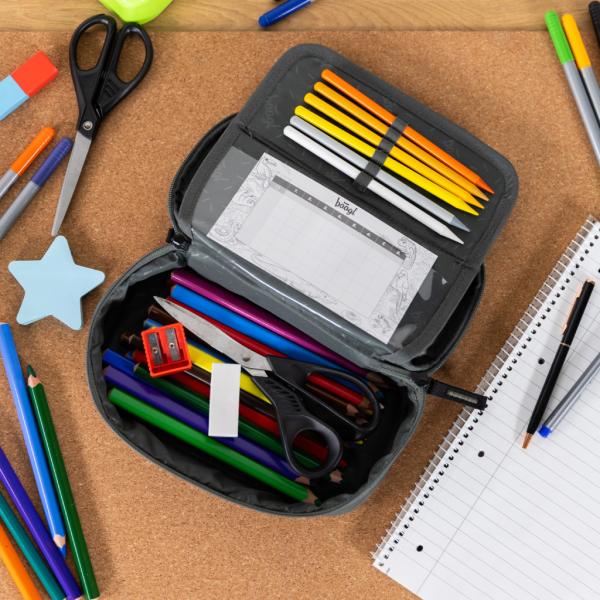 • Kompaktní penál na zip s prostornou hlavní přihrádkou a dvojitou klopou nabízí dostatek místa na psací potřeby a drobnosti.
